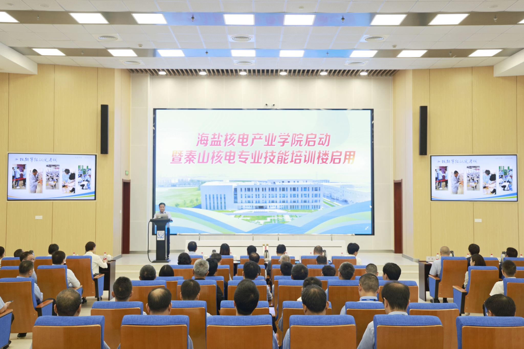 10月7日,海鹽核電產業學院啟動暨秦山核電專業技能培訓樓啟用儀式在海鹽秦山核電站舉行。中國核電總經理、黨委副書記鄒正宇,浙江省總工會常委、省部屬企事業工會主席葉龍茂,嘉興市人社局黨委委員、副局長易連強,海鹽縣人民政府副縣長范正華,嘉職院黨委委員、副院長項大海,秦山核電總經理、黨委副書記尚憲和出席。