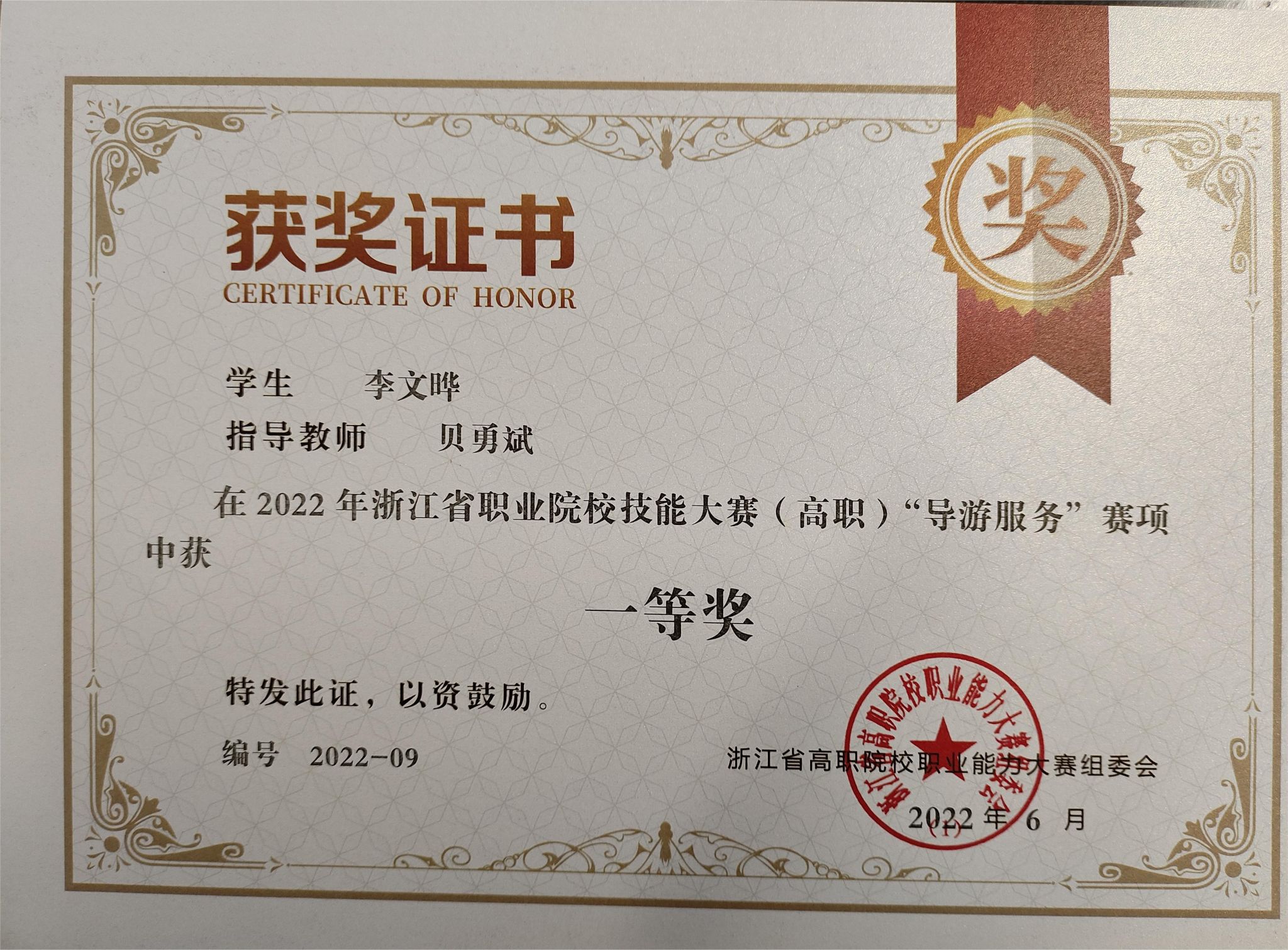 2017年獲浙江省導游服務技能大賽 三等獎;