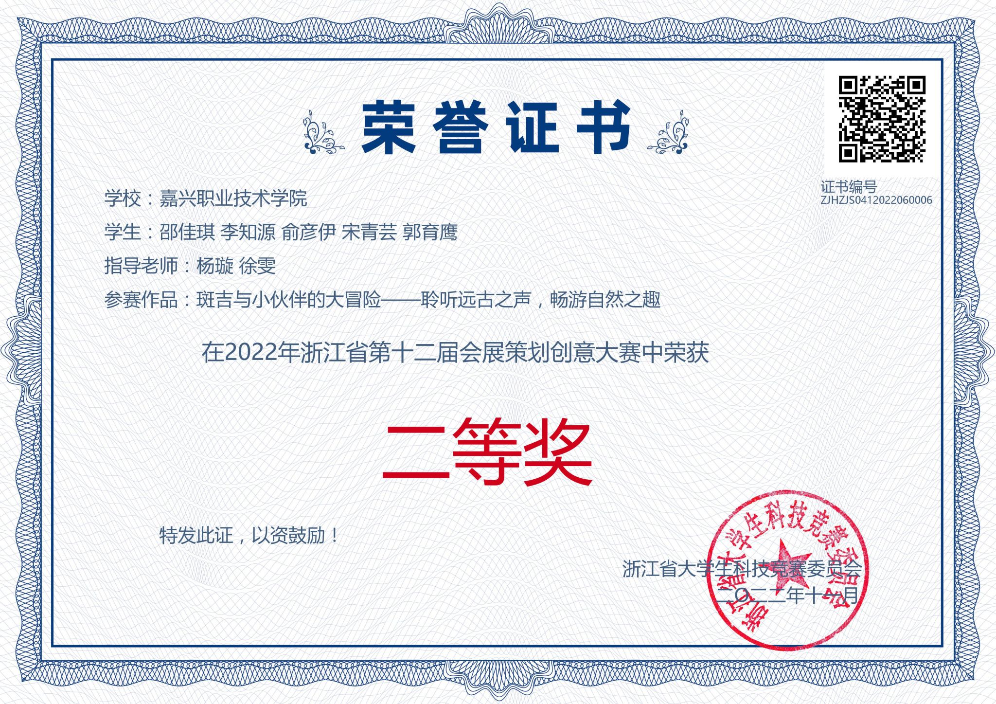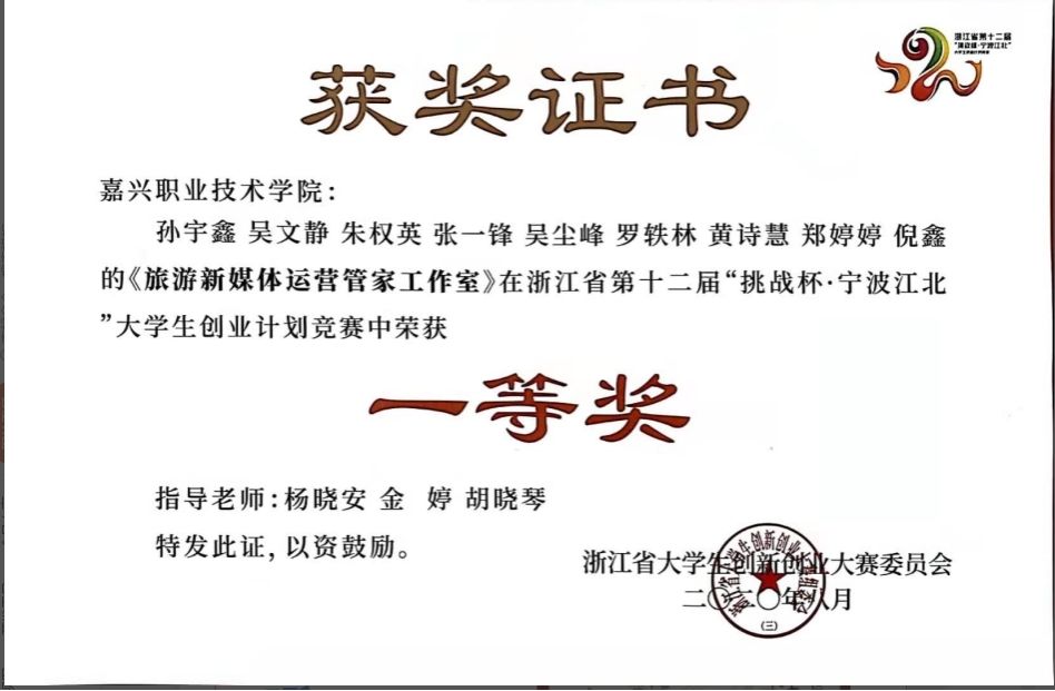 2020年獲浙江省第十二屆“挑戰杯·寧波江北”大學生創業計劃競賽一等獎;