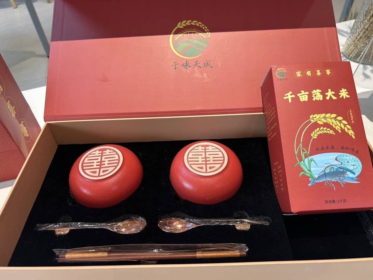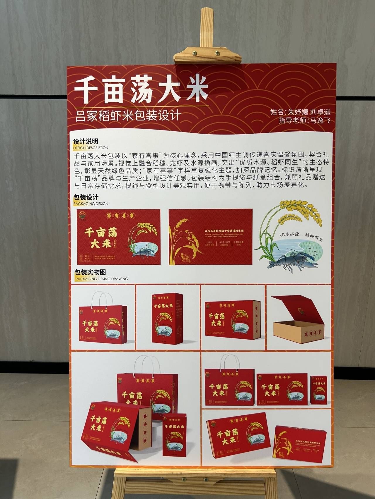 現(xiàn)場,形式各異的農(nóng)產(chǎn)品包裝作品整齊陳列,參賽學(xué)生依次向評委介紹創(chuàng)作靈感。從望海街道稻蝦米的簡約生態(tài)包裝,到南北湖橘子的創(chuàng)意禮盒,再到于城千畝蕩大米的喜慶包裝、百步經(jīng)濟(jì)開發(fā)區(qū)(百步鎮(zhèn))蜜梨的保鮮設(shè)計(jì),每一件作品都充滿巧思。由數(shù)字媒體專業(yè)大二學(xué)生朱妤婕與工業(yè)設(shè)計(jì)專業(yè)大二學(xué)生劉卓遙共同設(shè)計(jì)的千畝蕩大米包裝格外亮眼,通體大紅色的禮盒高級大氣,內(nèi)部嵌入兩只印有“福”字的陶瓷喜碗,搭配印有卡通藍(lán)龍蝦與水稻圖案的大米包裝袋,顯得十分喜慶。