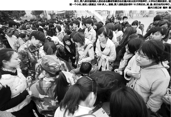 昨日,第八屆全國殘疾人運動會志愿者招募活動在嘉興職業技術學院舉行,大學生們踴躍報名。短短一個小時,報名人數就達1200多人。據悉,第八屆殘運會明年10月將在杭、湖、嘉、紹四地同時舉行。