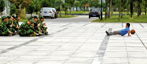 9月25日,在嘉職院,一個小孩突然“造訪”,時不時做個動作,讓原本在軍訓中又苦又累的大學生樂得哈哈大笑。
