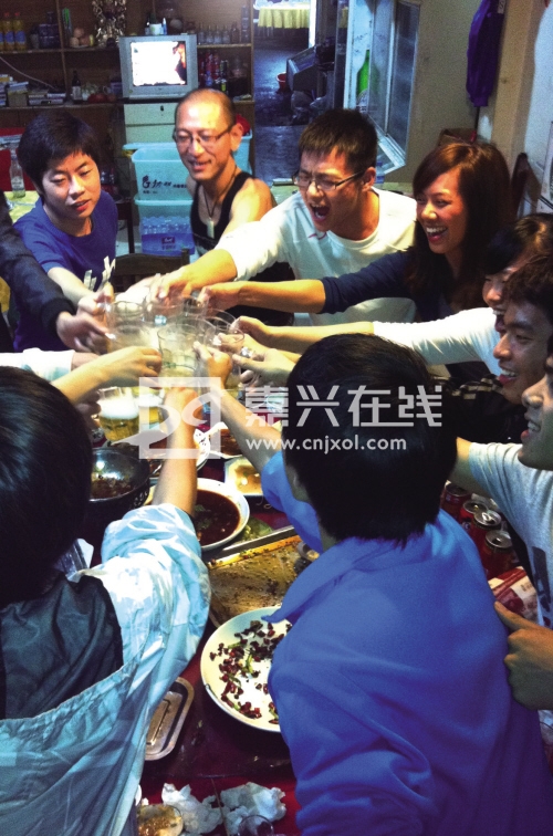 在市區(qū)城北大排檔,嘉職院學(xué)生舉杯慶祝“天宮一號”升空。