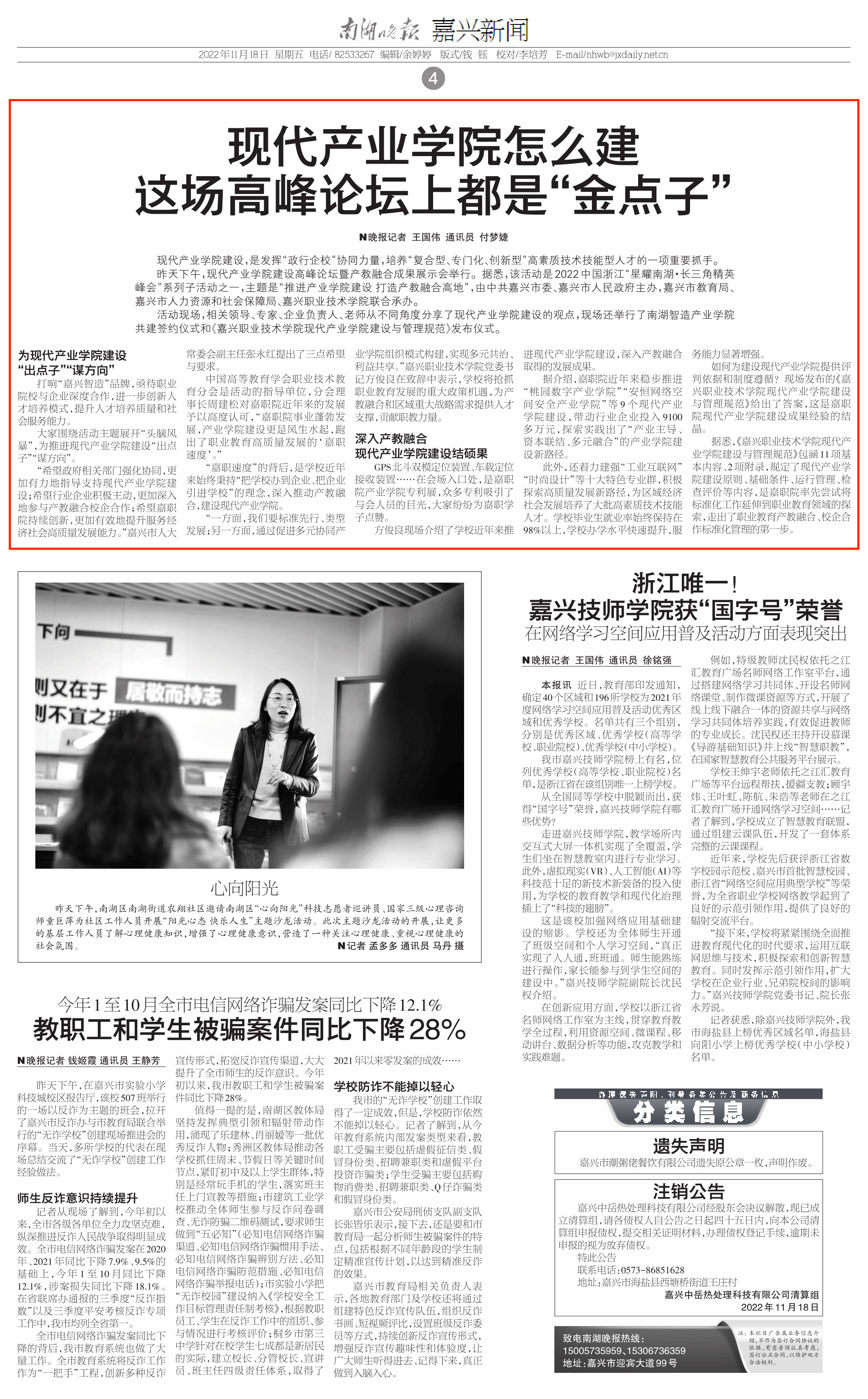 據介紹,嘉職院近年來穩步推進“桃園數字產業學院”“安恒網絡空間安全產業學院”等9個現代產業學院建設,帶動行業企業投入9100多萬元,探索實踐出了“產業主導、資本聯結、多元融合”的產業學院建設新路徑。