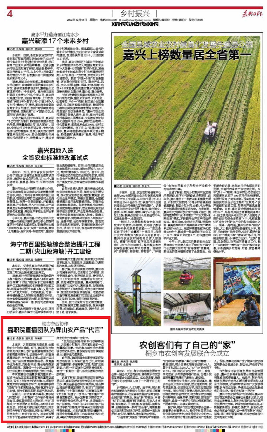 記者了解到,自結對幫扶四川省屏山縣以來,嘉職院時尚設計學院多次與市長三辦、屏山縣委縣政府溝通交流,結合屏山縣經濟建設發展特點,制定了“黨建強基領航”“鄉村振興賦能”“共同富裕發展”3大工程,組建了一支50人“青禾越川”志愿者直播團隊,充分發揮數字媒體藝術、電子商務專業優勢,多平臺、多渠道助力農產品銷售。今年11月,四川屏山農產品通過學校“石榴花開”輔導員工作室抖音號在線直播,1小時內直播間觀眾量破萬,椪柑全部售罄,幫扶工作取得的階段性成果,得到了兩地政府的高度評價。