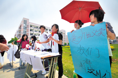 昨天中午,嘉興職業技術學院紡工分院服裝系的同學在學校廣場舉辦了手繪T恤義賣活動,同學們義賣精心繪制的愛心T恤籌集款項,為災區獻上一分愛心。