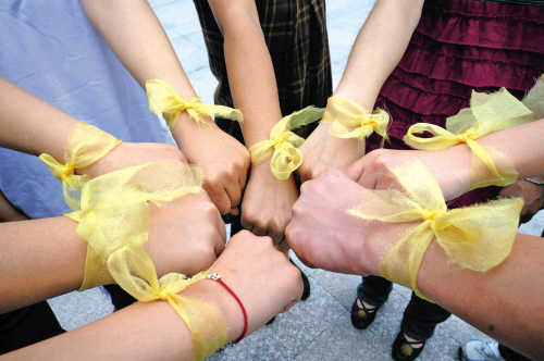 昨天上午,嘉興職業技術學院國商062班的同學開展了“黃絲帶情牽四川”活動,同學們系上了手工制作的黃絲帶,共同為四川災區祈福。
