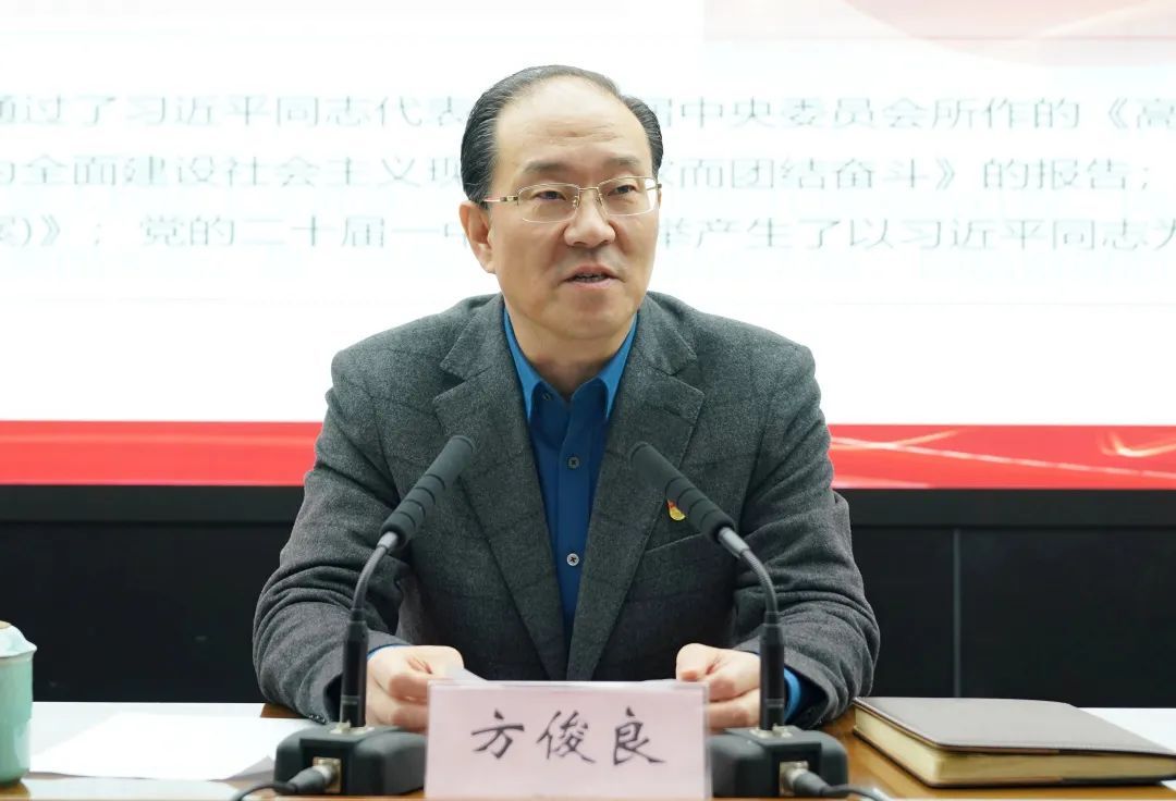 方俊良指出,要把學習貫徹習近平新時代中國特色社會主義思想作為思想理論武裝的重中之重,堅決貫徹執行黨的教育方針,牢記立德樹人根本任務,牢記提高人才培養質量、辦好人民滿意的教育的立校之本。要堅持在理論學習上同黨中央要求保持高度一致,以深入學習黨的二十大精神為契機,用思想自覺引領行動自覺,把樹牢“四個意識”、堅定“四個自信”、做到“兩個維護”、捍衛“兩個確立”落實到辦學治校、立德樹人的具體實踐中。