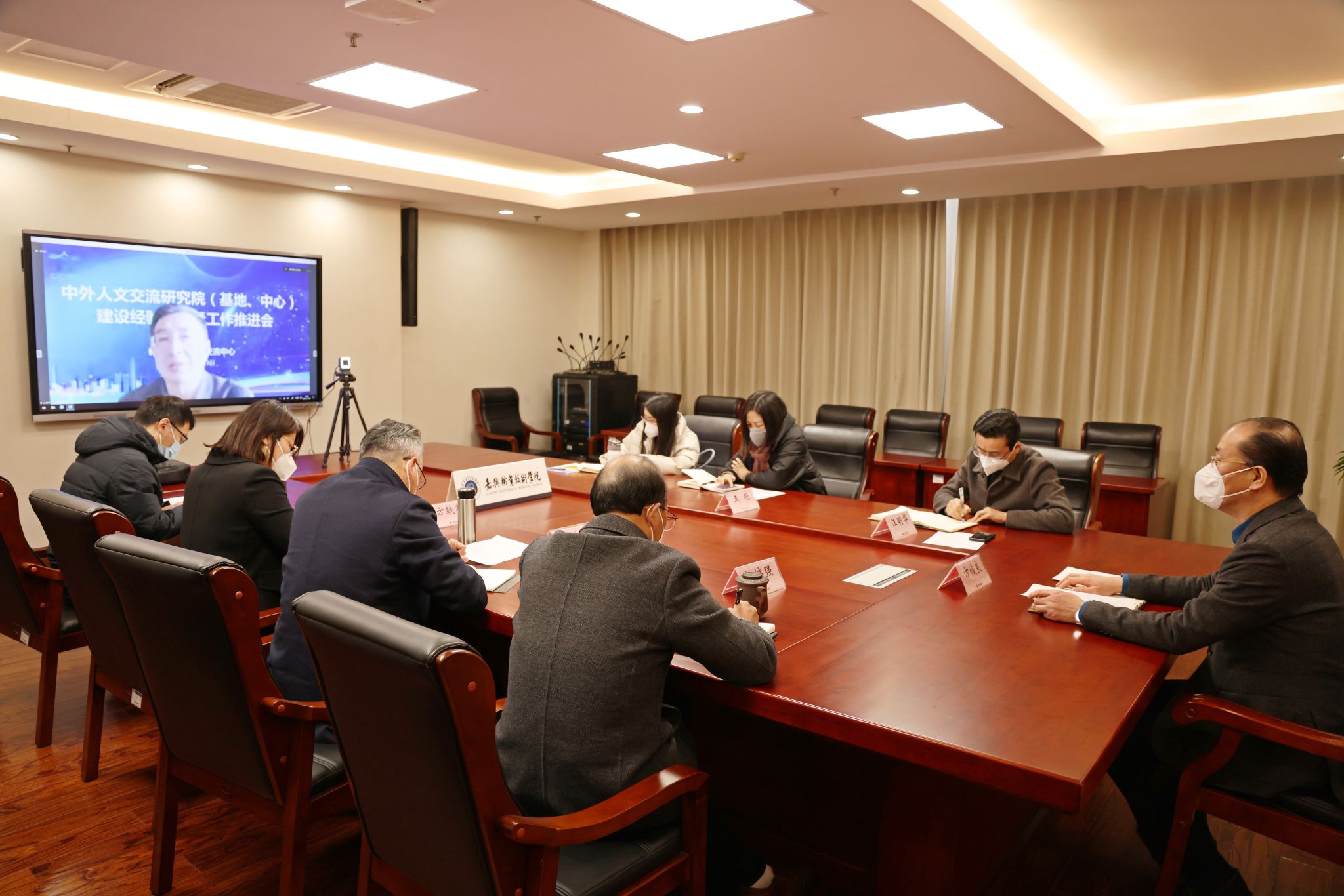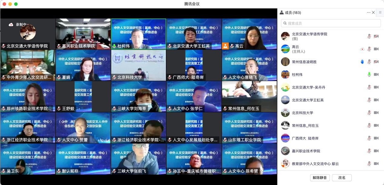 12月23日,教育部中外人文交流中心召開行業中外人文交流研究院建設經驗交流暨工作推進視頻會,教育部中外人文交流中心主任杜柯偉出席并作工作報告,教育部中外人文交流中心副主任夏娟主持,嘉職院黨委書記、紡織服裝(絲綢)行業中外人文交流研究院理事長方俊良,黨委副書記、院長、紡織服裝(絲綢)行業中外人文交流研究院院長楊培強出席會議。