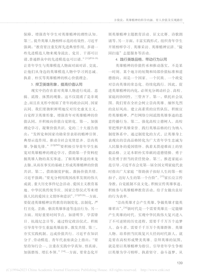 英雄精神是我們中華民族不斷向前的不竭動(dòng)力,英雄精神永不過(guò)時(shí)。要真正發(fā)揮好英雄精神的育人價(jià)值,就要通過(guò)營(yíng)造輿論氛圍、強(qiáng)化教育培訓(xùn)、加強(qiáng)制度建設(shè)等方式,使之內(nèi)化為青年學(xué)生穩(wěn)定的精神結(jié)構(gòu)、思維方式和行為準(zhǔn)則。