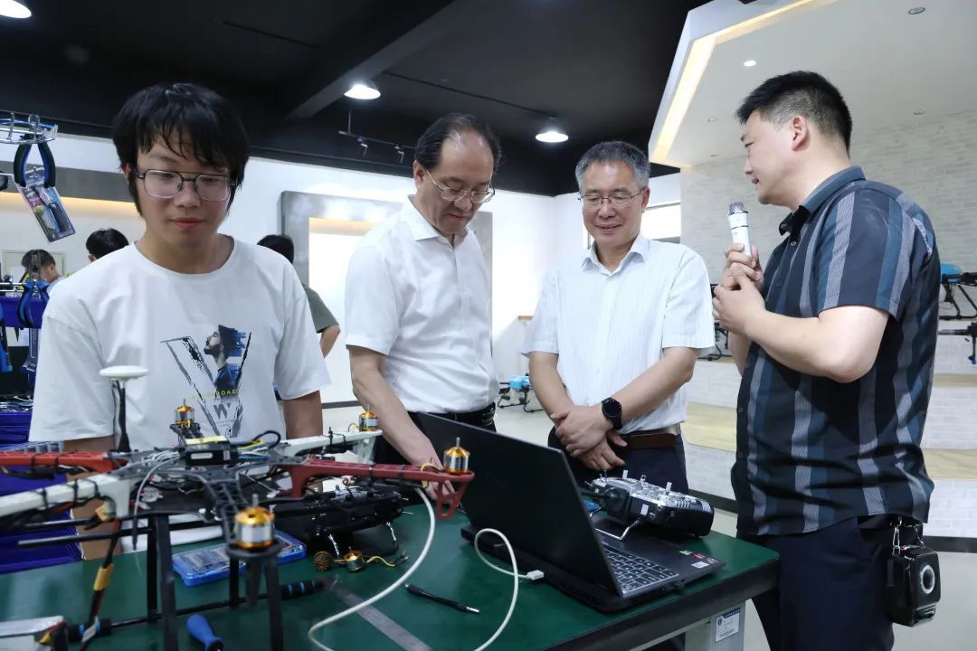 蔣國俊一行到學(xué)校無人機協(xié)同創(chuàng)新中心和工業(yè)互聯(lián)網(wǎng)智能產(chǎn)線綜合實訓(xùn)中心,實地了解無人機專業(yè)和工業(yè)互聯(lián)網(wǎng)專業(yè)的師資隊伍、人才培養(yǎng)、技術(shù)創(chuàng)新、社會服務(wù)等情況。與師生親切交談,仔細詢問無人機的種類和用途,現(xiàn)場觀摩學(xué)生實操模擬,關(guān)心學(xué)生對所學(xué)技能的掌握程度,詳細了解學(xué)校的招生和留嘉率情況。