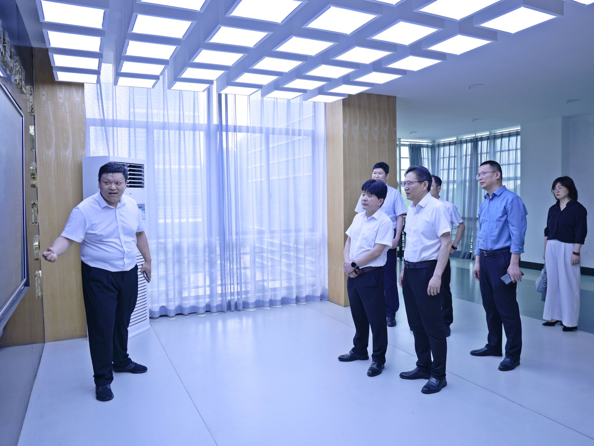 吳國飛一行來到學(xué)校現(xiàn)代教育技術(shù)中心、數(shù)字化教學(xué)空間,詳細了解學(xué)校智慧校園建設(shè)、數(shù)字化人才培養(yǎng)等情況。