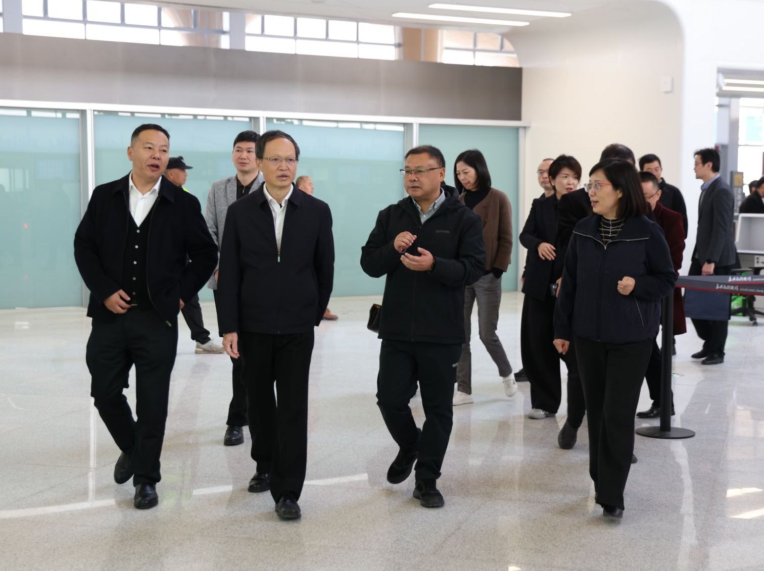 在嘉興南湖機場,朱學軍、張紅一行先后參觀了航站樓、候機大廳、貴賓室等區域,深入了解機場的建設規模、功能布局、運營籌備等情況。