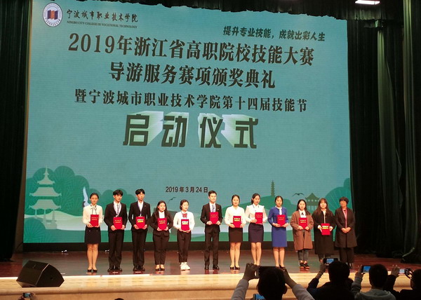 3月22-24日,2019年浙江省高職高專院校“導(dǎo)游服務(wù)”技能大賽暨全國職業(yè)院校技能大賽選拔賽在寧波城市職業(yè)技術(shù)學(xué)院舉行。共有來自全省24所院校的154名選手參加普通話導(dǎo)游服務(wù)組和英語導(dǎo)游服務(wù)組比賽。學(xué)院派出旅游管理專業(yè)學(xué)生參加兩個組別的比賽,獲得一等獎1項,二等獎2項,三等獎2項,實現(xiàn)我校旅游專業(yè)省級職業(yè)技能競賽一等獎零的突破。