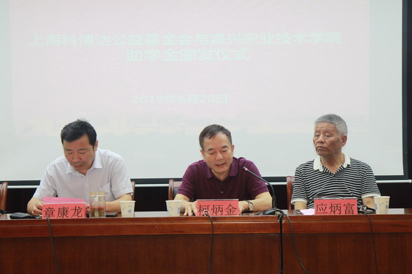 上海科博達公益基金會代表柯炳金、應炳富、浙江科博達公司總經理助理祁新茹、培訓專員李亭亭和校領導趙云、章康龍出席頒發儀式。學工部、機電與汽車學院負責人、教研室專業教師和學生代表一同參加。儀式由機電與汽車學院黨總支副書記、院長戈秀龍主持。