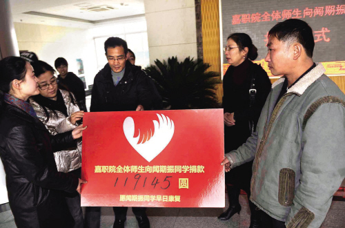 聞期振的事情被學校得知后,院領導高度關注,短短幾天時間內,全校師生紛紛捐款相助,籌集到的善款超過11萬元。此事經網絡、電臺、報紙報道后,湖州、嘉興等地的市民爭相獻出愛心。