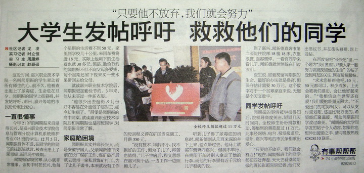 “只要他不放棄,我們就會努力!”現在,聞期振班上的同學都在四處奔走,天天去看望聞期振的班長張超告訴記者,他們發出倡議書,并在街頭募捐、網上發帖。