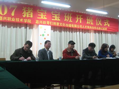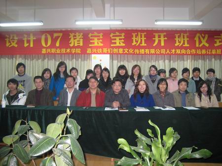 2009年12月1日下午3:30,我院紡織與藝術設計分院、嘉興鐵哥們創意文化傳播有限公司共同實施人才雙向合作培養暨創意設計07豬寶寶班開班儀式在學院7號樓202室隆重舉行。嘉興鐵哥們創意文化傳播有限公司總經理朱克峰,學院科技與產學合作處處長黃雪峰及沈銘鐘老師,紡織與藝術設計分院黨總支書記藍烈煌、副院長陸金英和李春暖以及設計教研室的部分教師出席開班儀式。開班儀式由分院副院長陸金英主持。