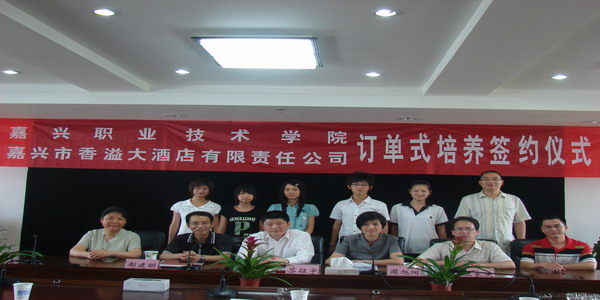學(xué)院黨委委員、副院長都建明,嘉興香溢大酒店有限責(zé)任公司總經(jīng)理蘇征宇,分別代表校企雙方進(jìn)行了簽約,同時(shí)酒店08級(jí)虞學(xué)博等五位同學(xué)與學(xué)校、企業(yè)三方進(jìn)行了簽約。