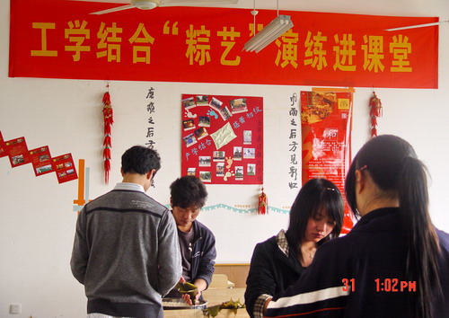 3月31日中午,在3-317教室,彌漫著清新的竹葉香味,工商077班18位學(xué)生在這里開(kāi)展了以“工學(xué)結(jié)合‘粽藝’演練進(jìn)課堂”為主題的包粽子實(shí)踐活動(dòng),在此之前,該班級(jí)已經(jīng)開(kāi)展了七次實(shí)踐培訓(xùn)。該班級(jí)新穎的教學(xué)模式和辦學(xué)特點(diǎn),引來(lái)了嘉興媒體的高度重視,南湖晚報(bào)記者親臨現(xiàn)場(chǎng),對(duì)班級(jí)學(xué)生進(jìn)行了采訪。