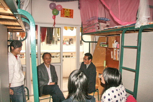 3月19日中午,盛健院長在學工部副部長、學生處副處長魯中海的陪同下,笑容滿面地來到7號樓210宿舍,親切看望英語083班的同學。同學們被院長的和藹可親深深地打動,他們紛紛地向院長匯報自己在學校的學習、生活狀況,為學校的發展建言獻策,表達了自己要努力學習,充分利用學校提供的有利條件學有所成,將來更好地服務于社會的熱切愿望。盛院長殷切地勉勵同學們,認真學習,積極參加各種社會實踐和學校的各類活動,汲取知識養分,培養多種能力,為將來的職業發展做好充分準備,也為學院的發展貢獻力量。交談中,210宿舍時時傳來爽朗的笑聲。