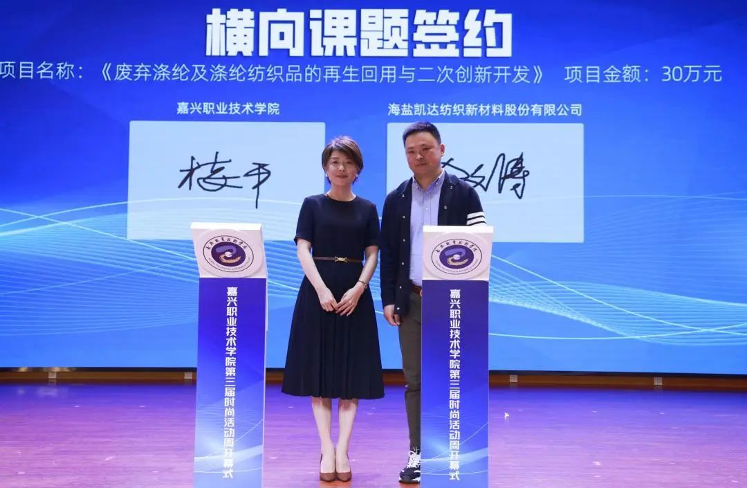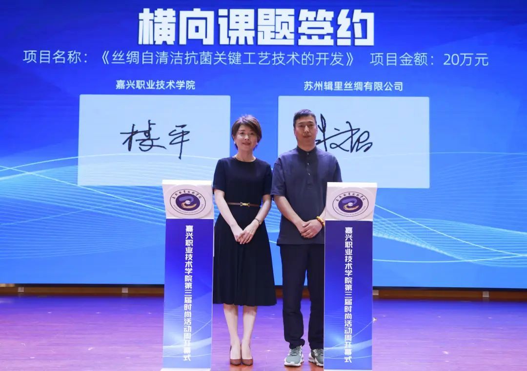 與海鹽凱達紡織新材料股份有限公司、蘇州輯里絲綢有限公司、嘉興市云龍服飾科技股份有限公司進行橫向課題及專利轉化簽約。