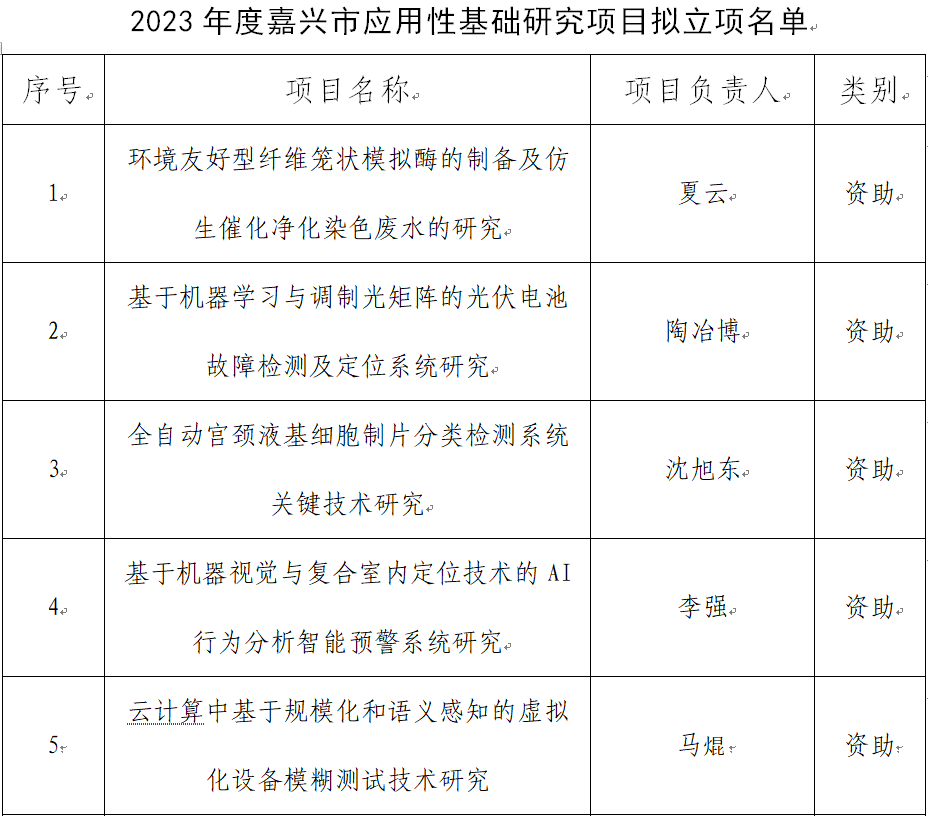 近日,2023年度嘉興市應用性基礎研究項目和民生科技創新研究項目擬立項名單公布,嘉職院共有15個項目成功立項,其中,財政資助項目9項,自籌項目6項。立項數量再創歷史新高,成績喜人。