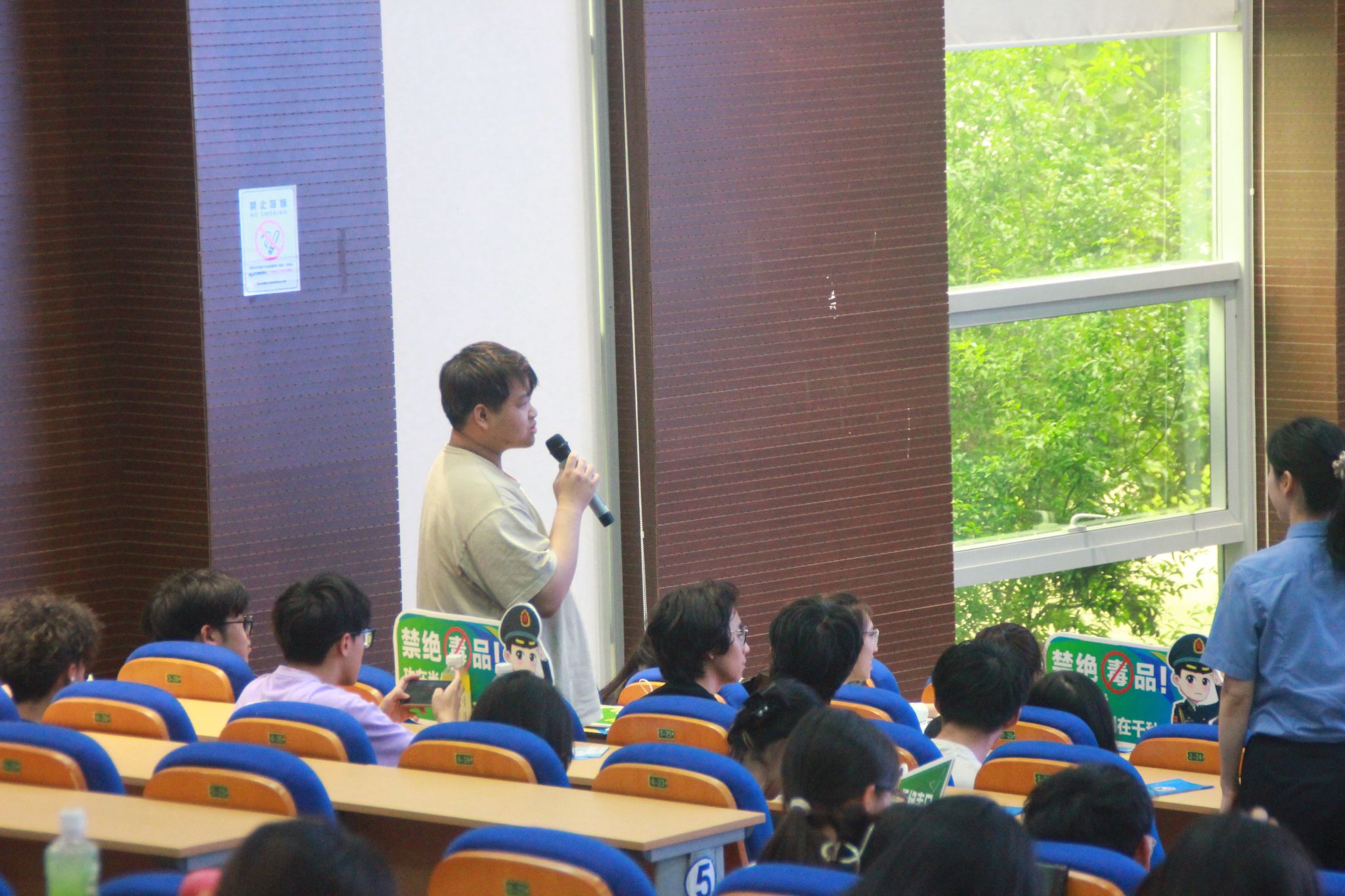吳海平圍繞毒品危害、禁毒知識、戒毒工作、拒毒方法等角度生動講解了新型毒品對人體生理及心理不可逆的傷害。在互動環節,禁毒宣講員對同學們發出“靈魂拷問”:為什么要參加禁毒宣傳?參加禁毒宣傳的益處?新型毒品有哪些?哪些人群容易吸毒?吸食毒品有何危害?同學們積極舉手參與回答,氣氛活躍。活動現場,禁毒宣講員們還為大家現場展示銀色“笑氣”瓶,并從特征、原理、案例等方面開展重點講解。