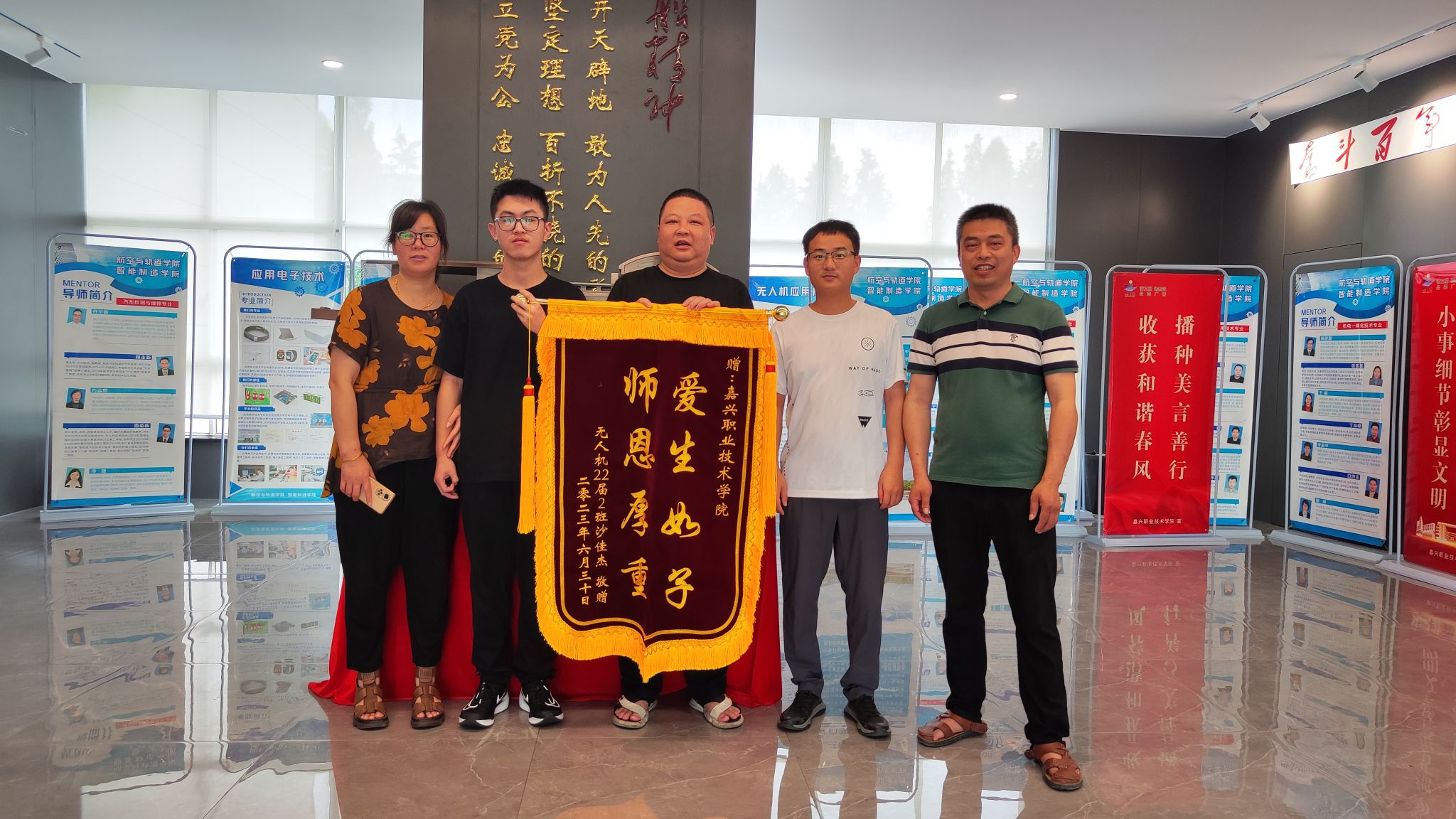 6月30日,航空與軌道學院、智能制造學院無人機222班沙佳杰同學的家長來到學校,當面向輔導員甘明星和班主任萬紫贈送感謝錦旗,誠摯表達了感謝之情。