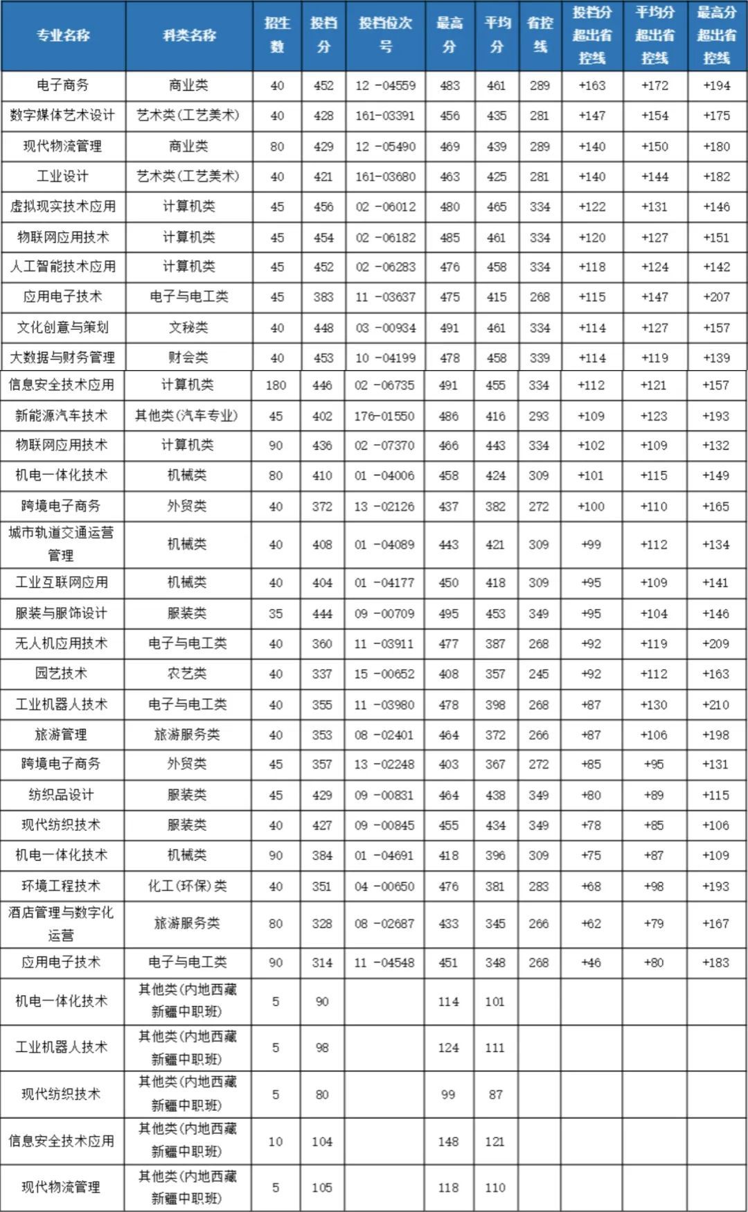 可喜的是,隨著學校近幾年的快速發展,社會影響力和美譽度不斷提升,所有招生專業投檔分、平均分、最高分在去年基礎上又有大幅提升。15個專業的投檔分數線超省控線100分以上,其中電子商務專業超163分;22個專業的錄取平均分超省控線100分以上,其中電子商務專業超172分。所有專業的錄取最高分全部超省控線100分以上,其中工業機器人技術專業超過210分。