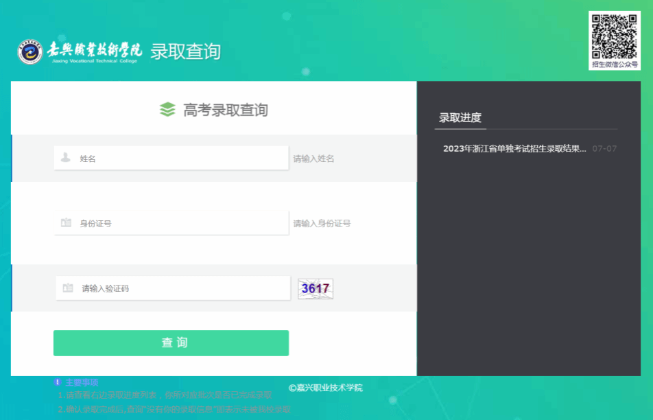 考生可登錄嘉職院招生網(https://zjw.jxvtc.edu.cn/)點擊首頁標題欄“信息公開”中的“高考錄取查詢”,進入查詢頁面后,輸入個人信息,點擊“查詢”即可查詢錄取結果。
