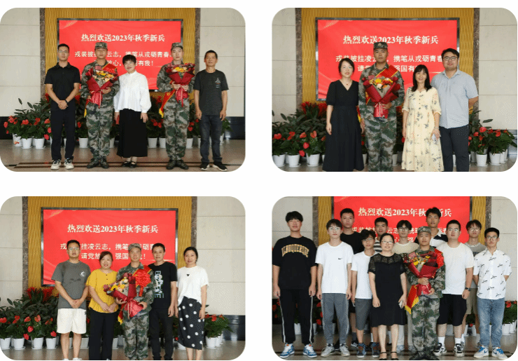 戎裝披掛凌云志,攜筆從戎礪青春。9月12日下午,嘉職院舉行2023年秋季大學生新兵入伍歡送儀式,為蔡斌、楊建軍、潘盼盼、謝傳赫、徐志偉、崔遠征、薛蒙蒙等7名預征新兵送行,其中蔡斌為二次入伍。黨委書記方俊良出席歡送儀式,為新兵送上鮮花和祝福,并合影留念。