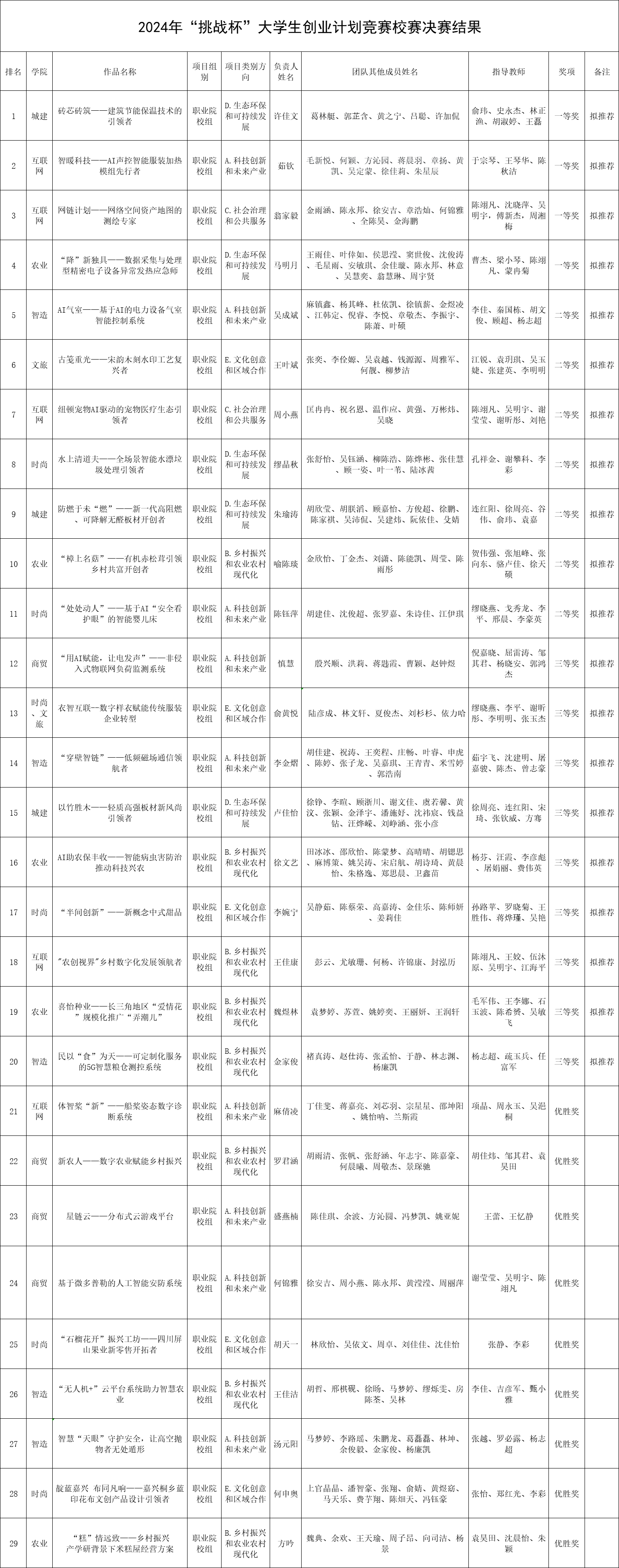根據(jù)《關(guān)于舉辦2024年“挑戰(zhàn)杯”大學(xué)生創(chuàng)業(yè)計(jì)劃競(jìng)賽校賽的通知》,經(jīng)校賽組織專家評(píng)審,共評(píng)選出一等獎(jiǎng)4項(xiàng),二等獎(jiǎng)7項(xiàng),三等獎(jiǎng)9項(xiàng),優(yōu)勝獎(jiǎng)9項(xiàng),現(xiàn)予以公示。公示期為2024年4月11日——2024年4月17日,如有疑問或異議,請(qǐng)及時(shí)與校團(tuán)委聯(lián)系,聯(lián)系電話:0573-89978126。