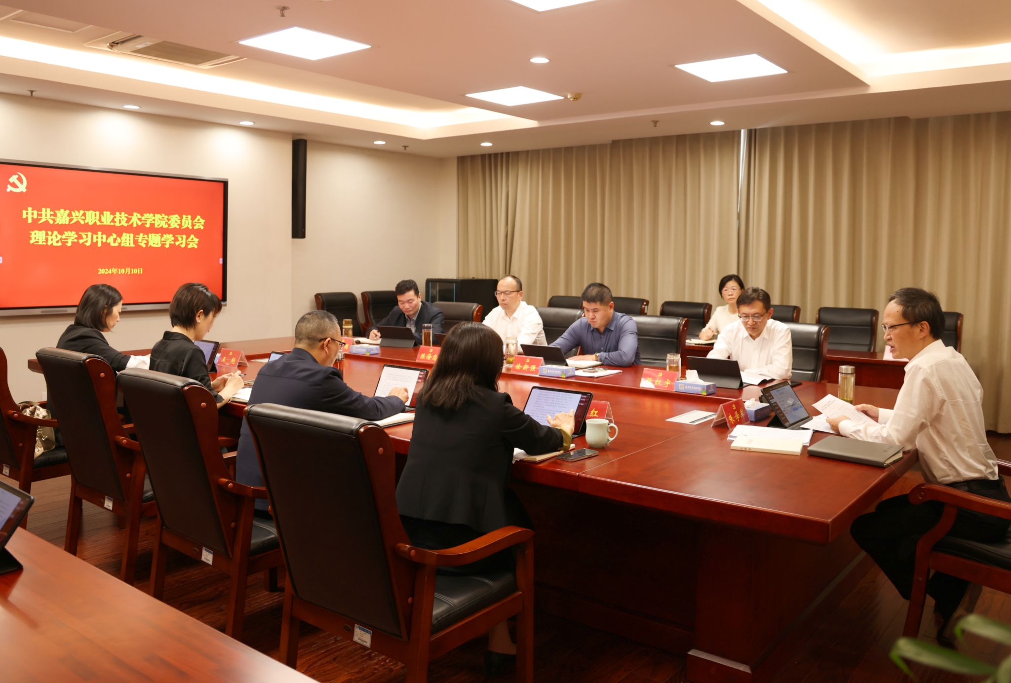 10月10日,嘉職院黨委理論學習中心組召開專題學習會,學習全國教育大會精神和習近平同志《論教育》。黨委書記朱學軍主持并作交流發言,黨委委員、副校長樓平作交流發言。