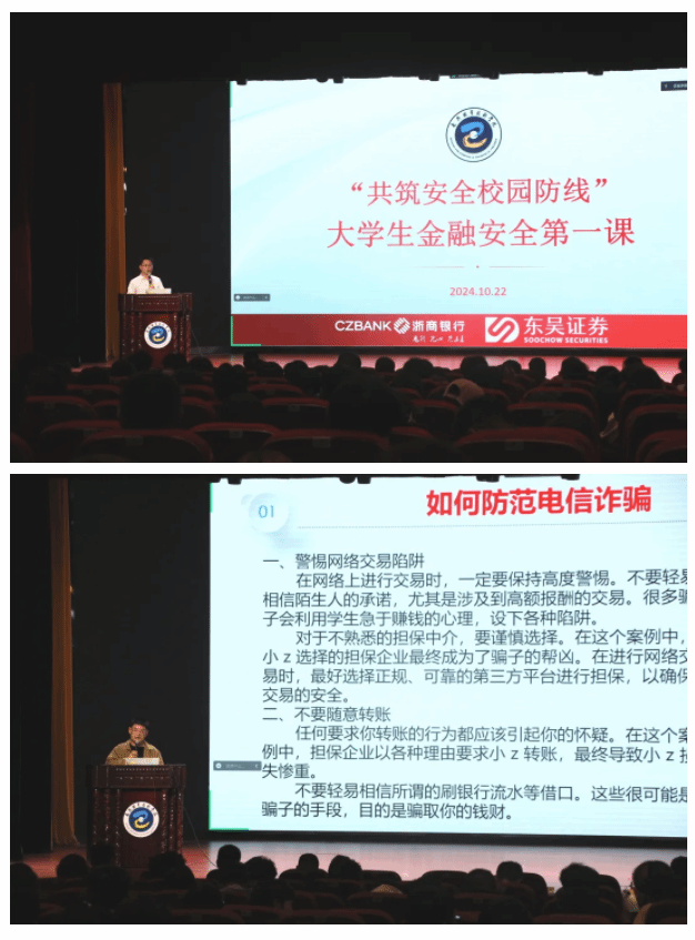 互聯網學院、網絡空間安全學院邀請東吳證券、浙商銀行嘉興分行經理為新生帶來財務安全講座。主講人講解了校園貸、個人征信管理、個人信息保護等方面的知識。通過生動的案例分析和實用的防范技巧,新生們對財務安全的重要性有了更加全面和深入的了解。