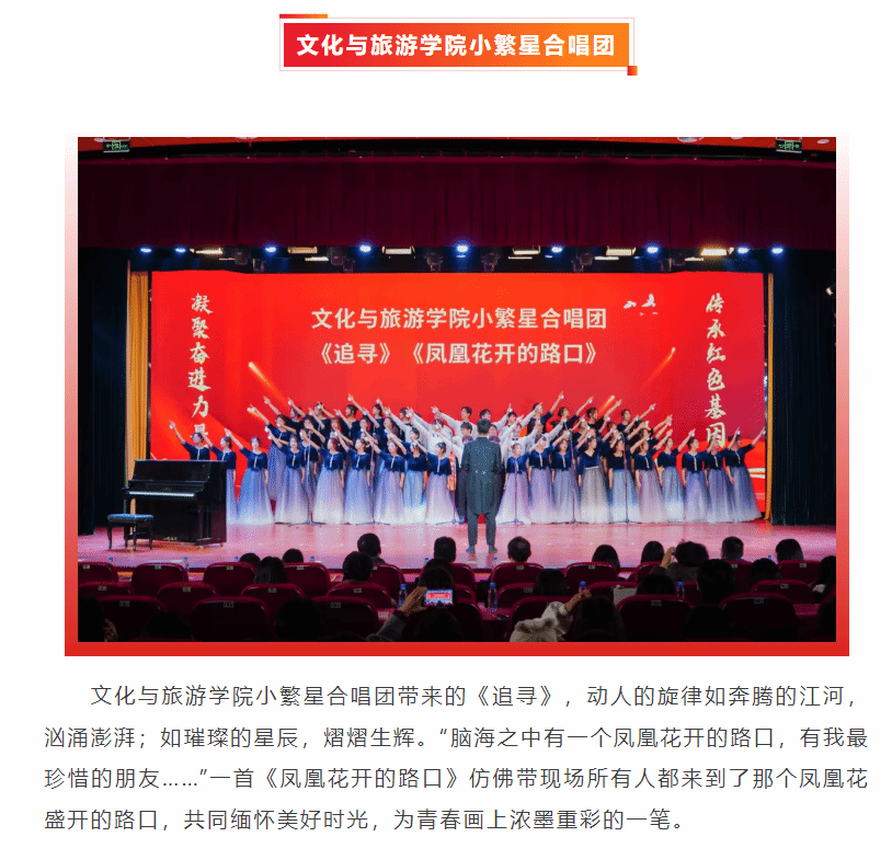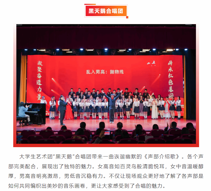 近日,嘉職院舉行第三屆大學生合唱文化節暨第十二屆紀念一二?九愛國運動合唱比賽。學校大學生藝術團“黑天鵝”合唱團和來自各二級學院的大學生合唱團以青春之聲謳歌黨的豐功偉績,唱出了對祖國美好河山的贊美和熱愛,展現出新時代青年的精神風貌。