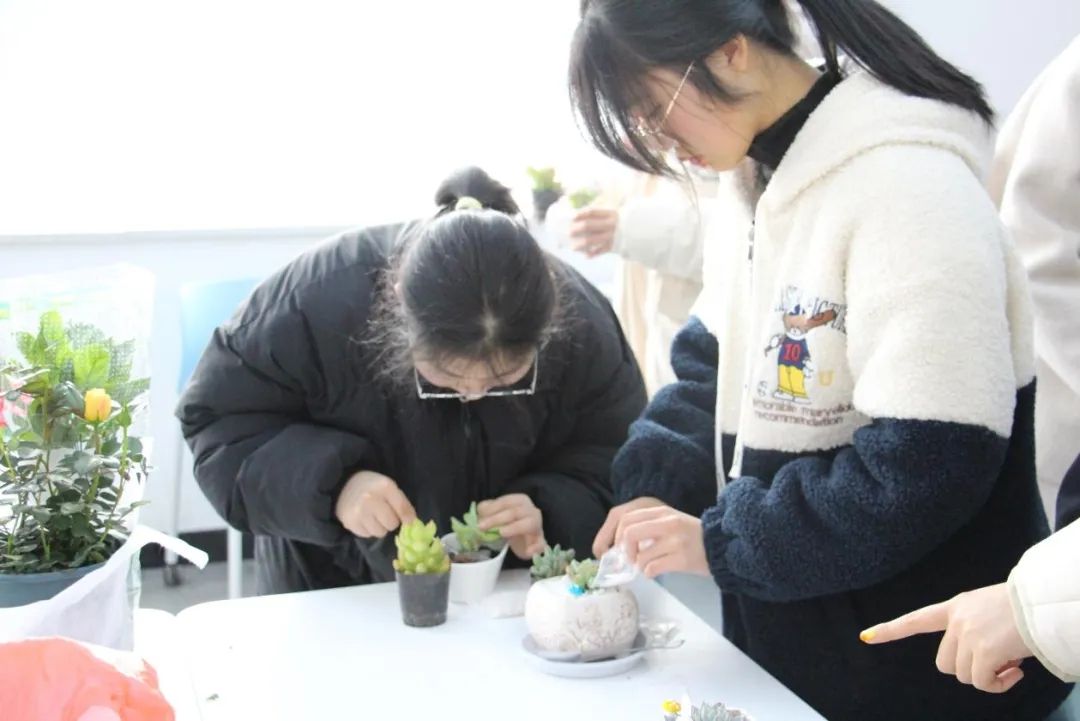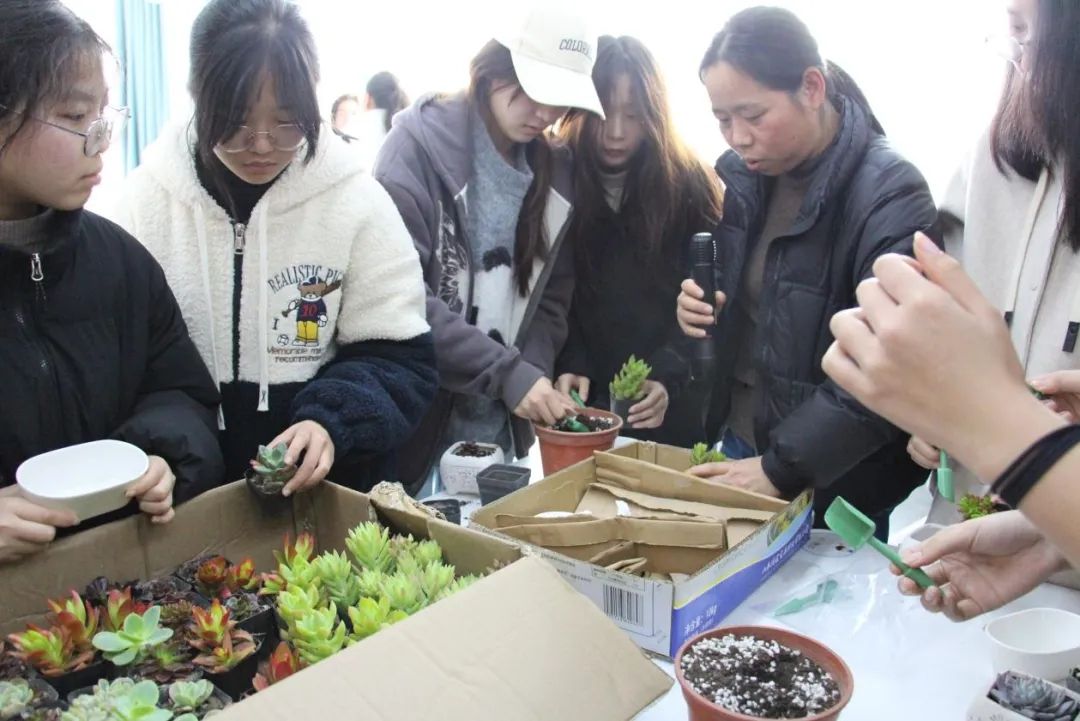 園藝專業(yè)教師為同學(xué)們講解了多肉植物的生長習(xí)性、養(yǎng)護(hù)技巧及移植注意事項(xiàng)。學(xué)生們化身“綠色設(shè)計(jì)師”,精心挑選桃蛋、熊童子、生石花等形態(tài)各異的多肉品種,搭配火山石、陶粒等裝飾材料,精心制作出獨(dú)具個(gè)性的多肉盆栽。