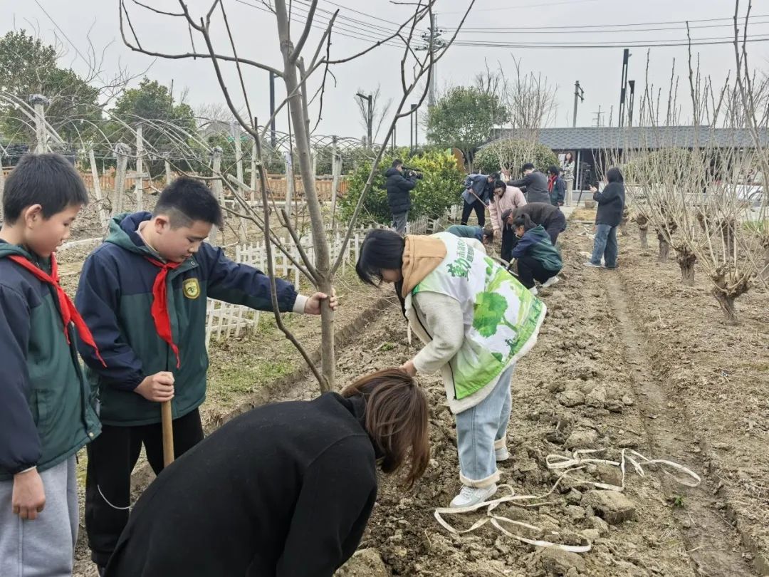 學(xué)生志愿者在專業(yè)老師的帶領(lǐng)下,走進(jìn)新豐鎮(zhèn)中心小學(xué),通過“科普+實(shí)踐”的沉浸式教育模式,與30余名小學(xué)生共同開展“大手牽小手 共育生態(tài)林”主題活動。園林專業(yè)教師通過“植物大講堂”,帶領(lǐng)孩子們觀察校園生態(tài)園植物群落,向孩子們講解光合作用奧秘、本地珍稀樹種保護(hù)現(xiàn)狀。志愿者們帶孩子們在勞動實(shí)踐基地栽種月季、杜鵑等花苗,培土澆水,30余株新苗在春日里昂首挺立。