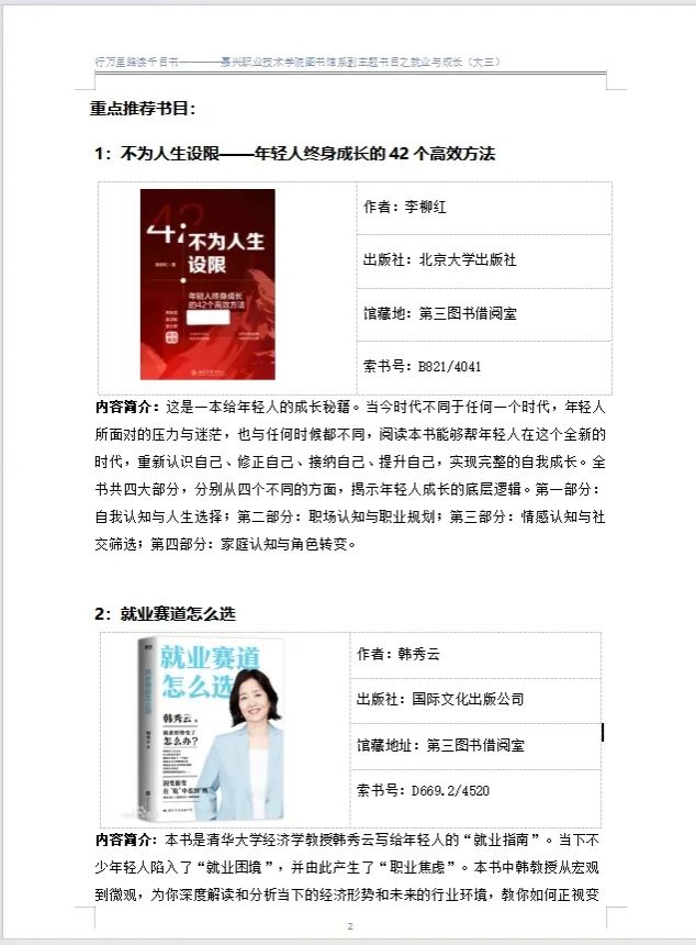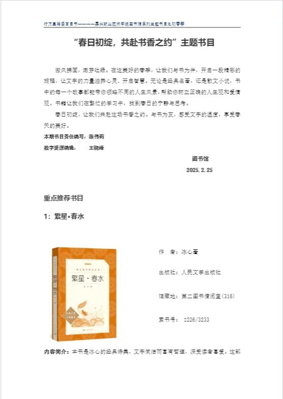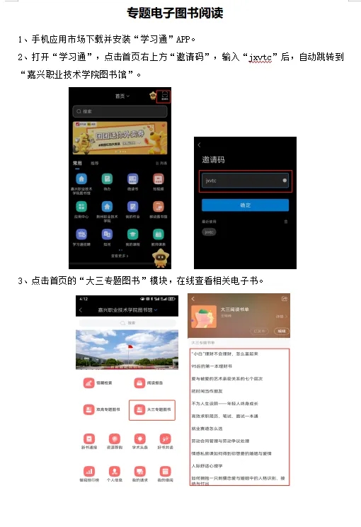 圖書館已陸續推出了雙高專題、大一職業規劃專題、大三就業專題、春日專題、剪紙專題、經典文學專題等6個專題,通過釘釘教職工群及閱讀助理群推送,同時請超星公司配合在學習通上推出各專題的電子圖書,可在線閱讀。