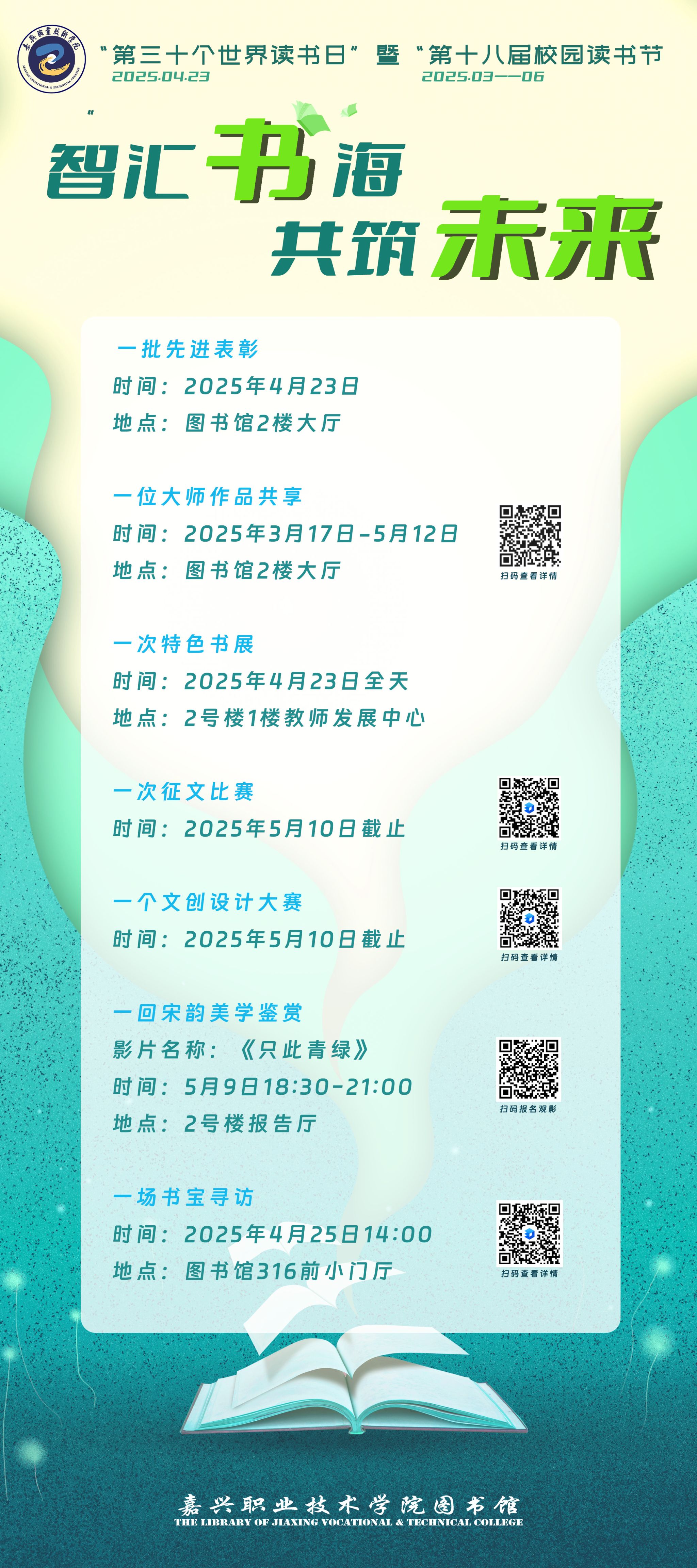本次讀書節(jié)系列活動是學(xué)校持續(xù)推進(jìn)“悅讀潤心·強國有我”讀書行動,深化“書香嘉職”建設(shè)的重要舉措。讀書節(jié)以“智匯書海,共筑未來”為主題,將開展“一批先進(jìn)表彰、一位大師作品共享、一次特色書展、一次征文比賽、一個文創(chuàng)設(shè)計大賽、一回宋韻美學(xué)鑒賞、一場書寶尋訪”“七個一”系列活動,讓閱讀更好的融入課堂、融入生活,讓閱讀文化更好的與校園文化、專業(yè)文化、工匠文化相融合,使閱讀真正成為滋養(yǎng)師生心靈、提升精神境界的載體。