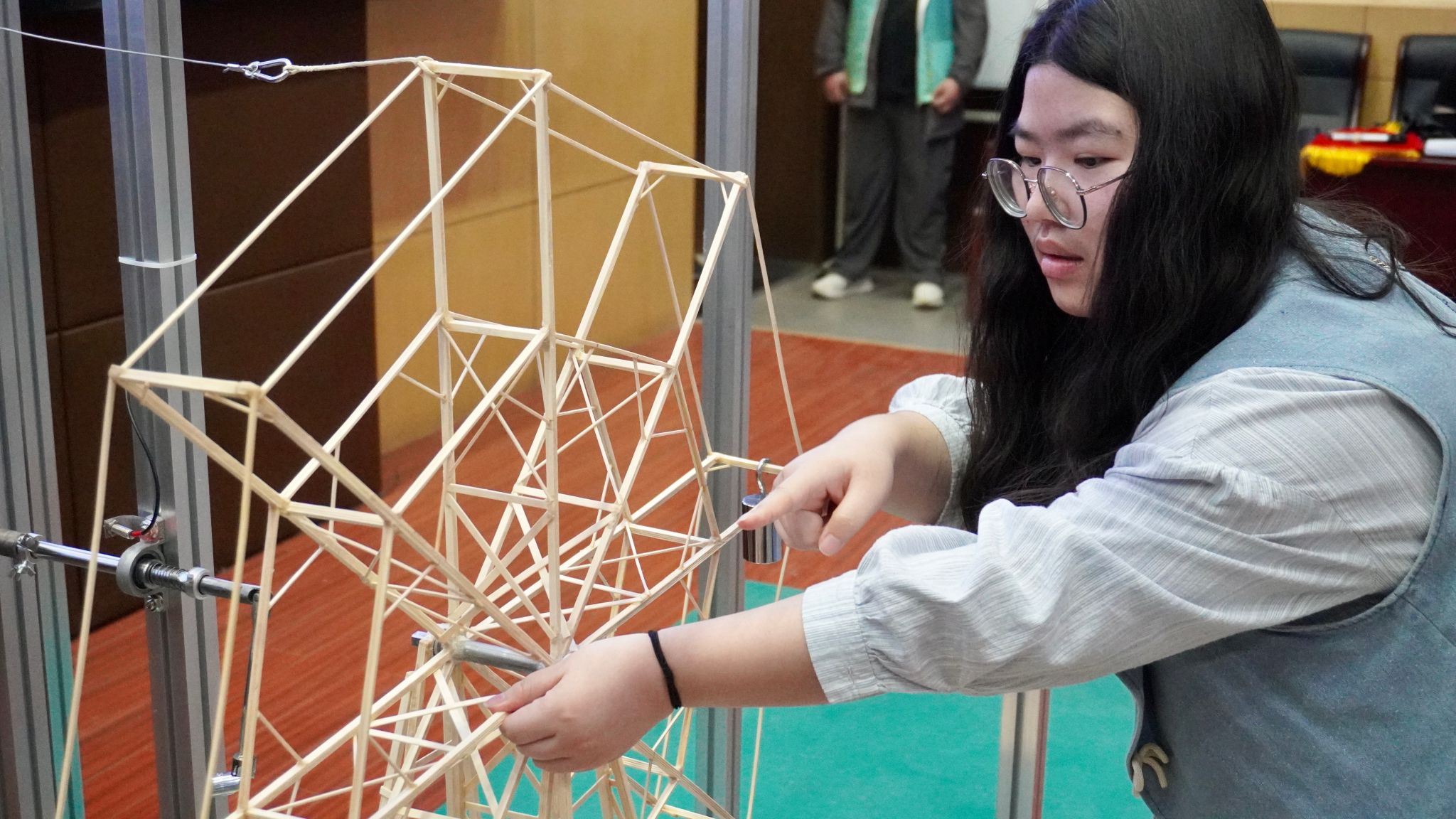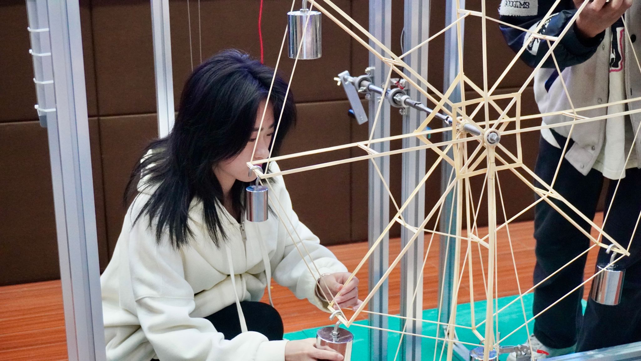 “此次比賽是一次將課堂上的結構力學公式變成可觸可感的實戰機會。我們團隊連續1個月駐扎實驗室,在指導老師帶領下優化了12個版本的摩天輪桁架節點設計。通過參與競賽,我們對理論知識有了更加深入、全面且系統的理解和掌握,同時在動手實踐中也顯著提升了結構制作、材料加工與動態調試等工程實操能力。”競賽一等獎獲得者,城市建設學院學生黃觀峰說。據悉,該團隊設計的竹制摩天輪結構模型以全場最輕的124.5克自重,成功承載7個總重達9千克的砝碼,創造出高達72倍(9kg/0.1245kg)的最優荷重比。其創新設計的轉輪結構在二級加載測試中表現優異,在20秒內完成了6圈標準轉速的平穩運轉,充分展現了團隊在輕量化結構設計與動態荷載優化方面的卓越能力。
