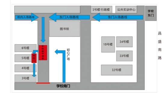 1.考試入場流程:根據浙江省教育考試院要求,嚴禁考生攜帶手機、藍牙耳機、智能手表(手環)等具有發送或接收信息功能的設備參加考試,如帶入考點須集中存放,考生需兩次安檢。考生按照制定線路(詳見圖1)到達手機集中保管區。從南門進入的考生,必須從手機集中保管處經過,再通過安檢門。工作人員在準考證上蓋“已上交”章,隨后經封閉通道在5號樓大臺階下過安檢門進行一次安檢,進入3號樓考場內再接受二次安檢。
