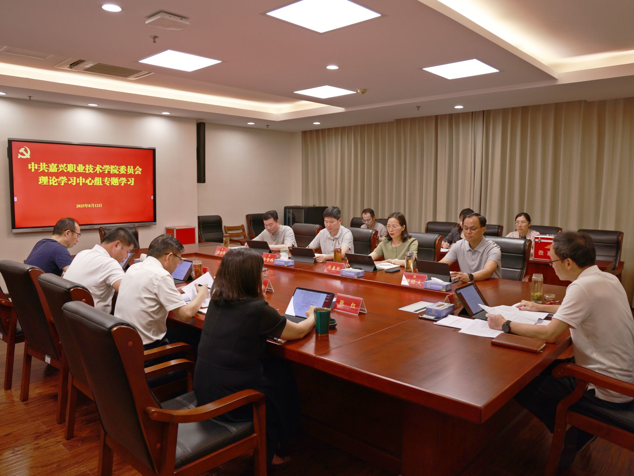 8月12日,嘉職院黨委理論學習中心組召開專題學習會,專題學習習近平總書記關于統計工作的重要講話和重要指示批示精神。黨委書記朱學軍主持并講話,黨委副書記、副院長程旺大,黨委委員、副院長金智鵬作交流發言。