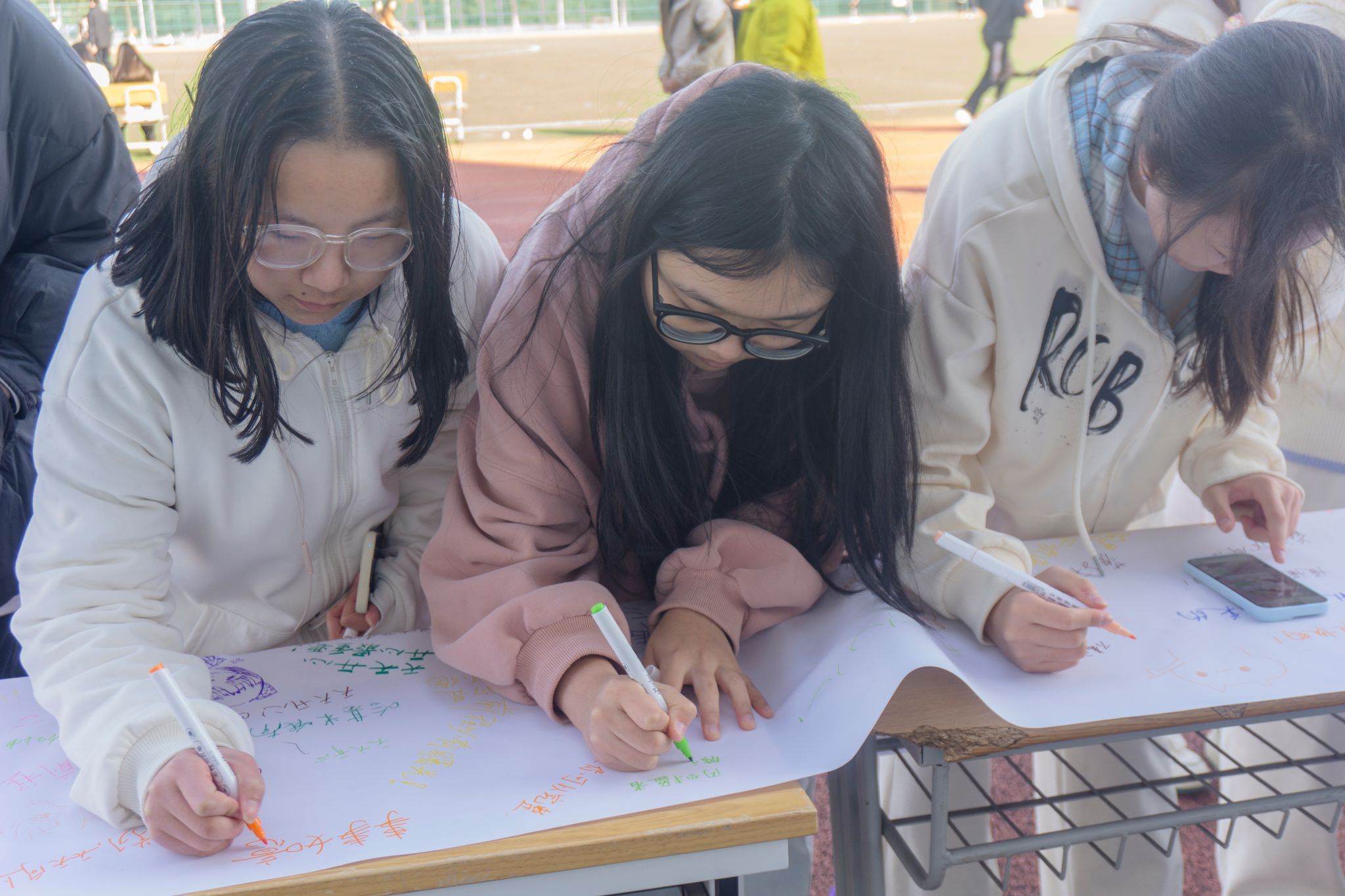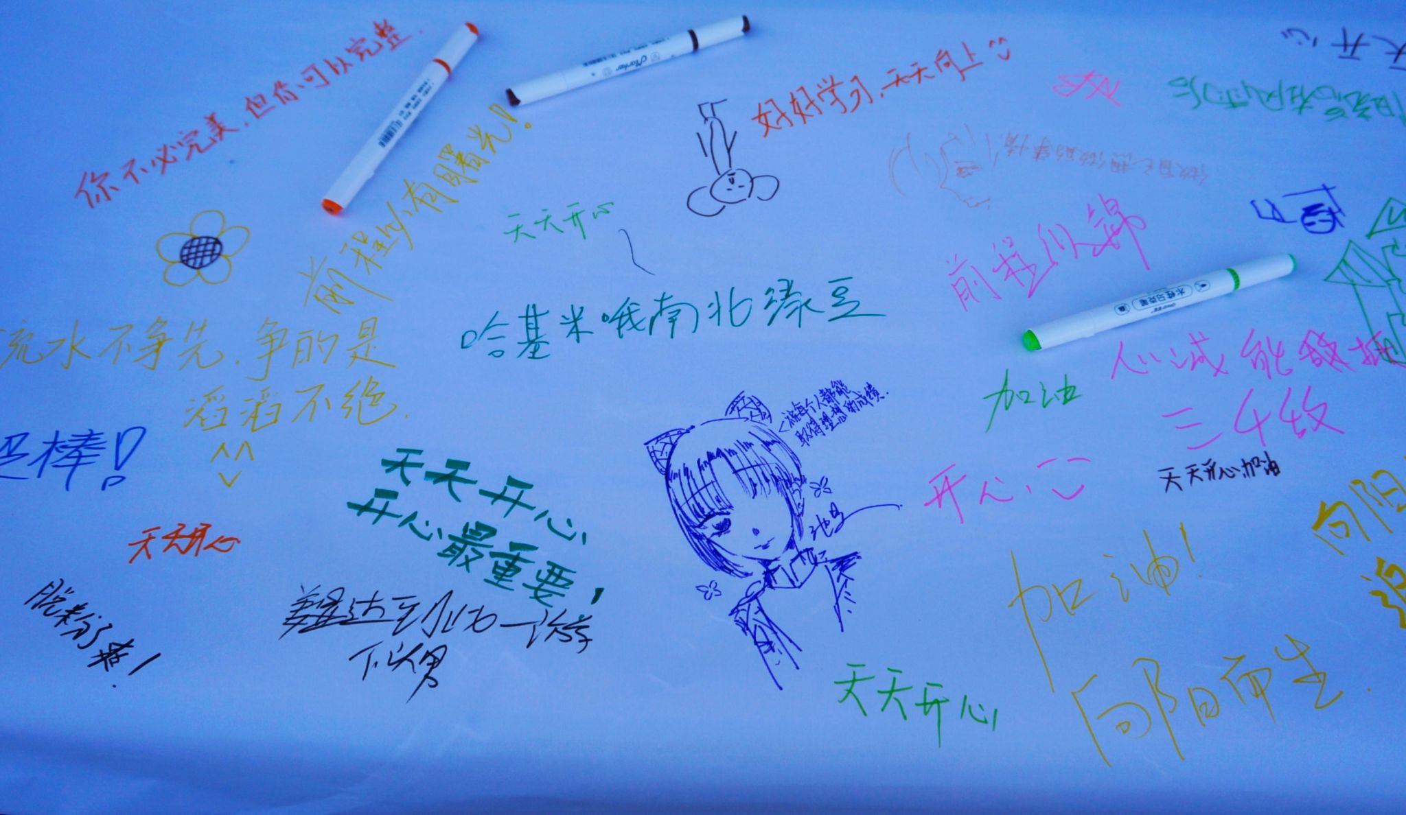“心情涂鴉墻” 前排起了長隊,大幅空白畫布在陽光下泛著光澤。同學們手持多彩馬克筆,有的畫下咧嘴笑的太陽、跳躍的彩虹,用明亮的黃、溫暖的橙勾勒出愉悅的心情;有的寫下 “今天超棒”“接納不完美” 等短句,用樸實的文字傾訴心聲。沒有規則的束縛、沒有評判的壓力,大家你一筆我一畫,原本空白的畫布漸漸變成斑斕的 “情緒光譜”。活動結束后,這幅承載著集體心意的作品被掛起,傳遞著 “每一種情緒都值得被溫柔接納” 的暖意。