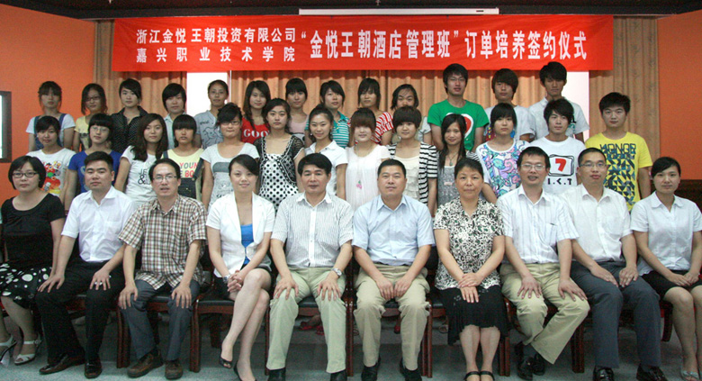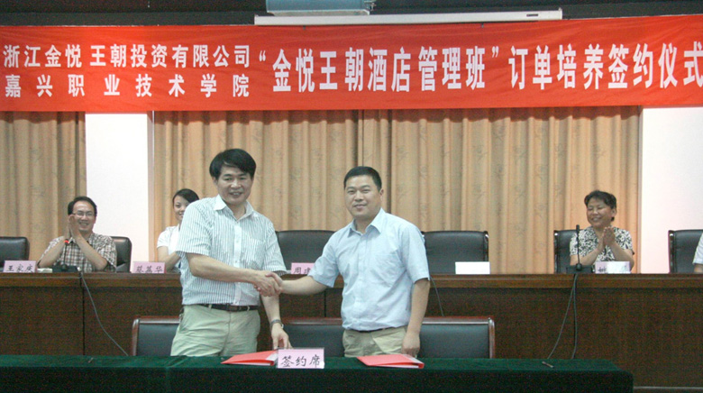 6月30日下午,我院與浙江金悅王朝投資有限公司再度簽訂了酒店管理班人才培養協議。學院黨委副書記、副院長周建新、浙江金悅王朝投資有限公司董事長盛富林、學院科技與產學合作處處長黃雪峰、外語與貿易分院黨總支書記、副院長姚寧屏、外語與貿易分院副院長王家慶及訂單班26位同學出席了簽約儀式。