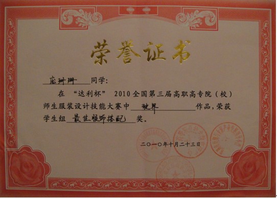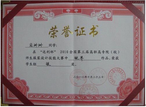 據了解,7月底經過專家評審,彭顥善老師指導學生參加本次大賽,該賽由教育部高職高專服裝紡織類專業教學指導委員會、中國高等職業技術教育研究會、中國紡織服裝教育學會聯合主辦,龐姍姍同學的作品在700多幅強手如林的作品中成功入圍決賽,全國共15名學生入圍。