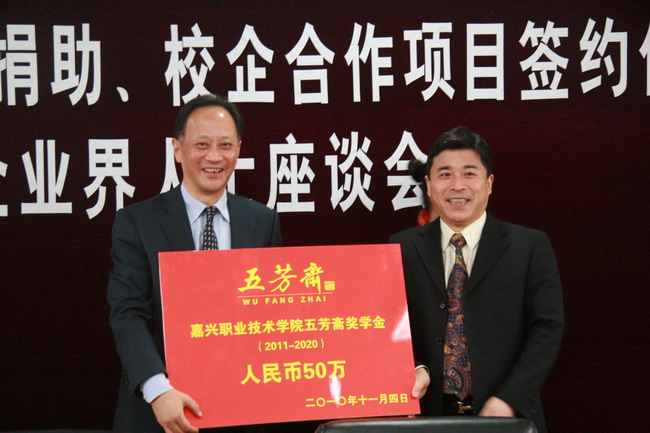 緊接著,五芳齋集團(tuán)總裁朱自強(qiáng)和盛健院長(zhǎng),舉行“五芳齋”獎(jiǎng)學(xué)助學(xué)金設(shè)立儀式。該集團(tuán)董事會(huì)決定在我院設(shè)立總額50萬(wàn)元的“五芳齋”獎(jiǎng)學(xué)助學(xué)金,獎(jiǎng)學(xué)助學(xué)金合作協(xié)議10年,每年發(fā)放5萬(wàn)元,用于鼓勵(lì)品學(xué)兼優(yōu)學(xué)生和資助家庭困難學(xué)生。