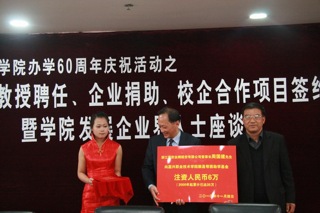 浙江嘉欣絲綢股份有限公司周?chē)?guó)建董事長(zhǎng)再次向順昌幫困順基金注資6萬(wàn)元,一如既往地幫助我院困難學(xué)生。至此,周?chē)?guó)建董事長(zhǎng)十年來(lái)累計(jì)向基金注資35萬(wàn)元。順昌幫困基金是在學(xué)院辦學(xué)五十周年慶典時(shí),周?chē)?guó)建董事長(zhǎng)以個(gè)人名義在學(xué)院設(shè)立的幫困助學(xué)基金,基金設(shè)立10年來(lái),每年資助15名品學(xué)兼優(yōu)的困難學(xué)生,以幫助困難他們順利完成學(xué)業(yè),激勵(lì)他們成長(zhǎng)成材。