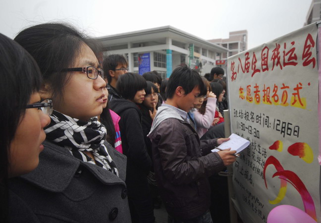 12月6日,第八屆全國殘疾人運動會志愿者招募活動在嘉興職業技術學院舉行,大學生們踴躍報名。短短一個小時,報名人數就達1200多人。據悉,第八屆殘運會明年10月將在杭、湖、嘉、紹四地同時舉行。(魏煒)