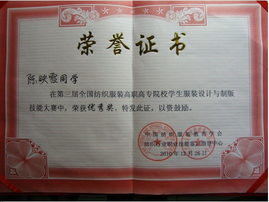 本次大賽共有來自全國26所高職高專院校的78位選手參加服裝設(shè)計與制版的比賽,經(jīng)過激烈的角逐,由陳泓、趙綺、羅曉菊三位老師指導(dǎo)的張宇婷、吳小笑、陳映雪三位同學(xué)分別榮獲銀獎、銅獎與優(yōu)秀獎。此外,我院還獲得了“團體組織優(yōu)勝獎”獎項,為學(xué)校爭得了榮譽。(趙琦)